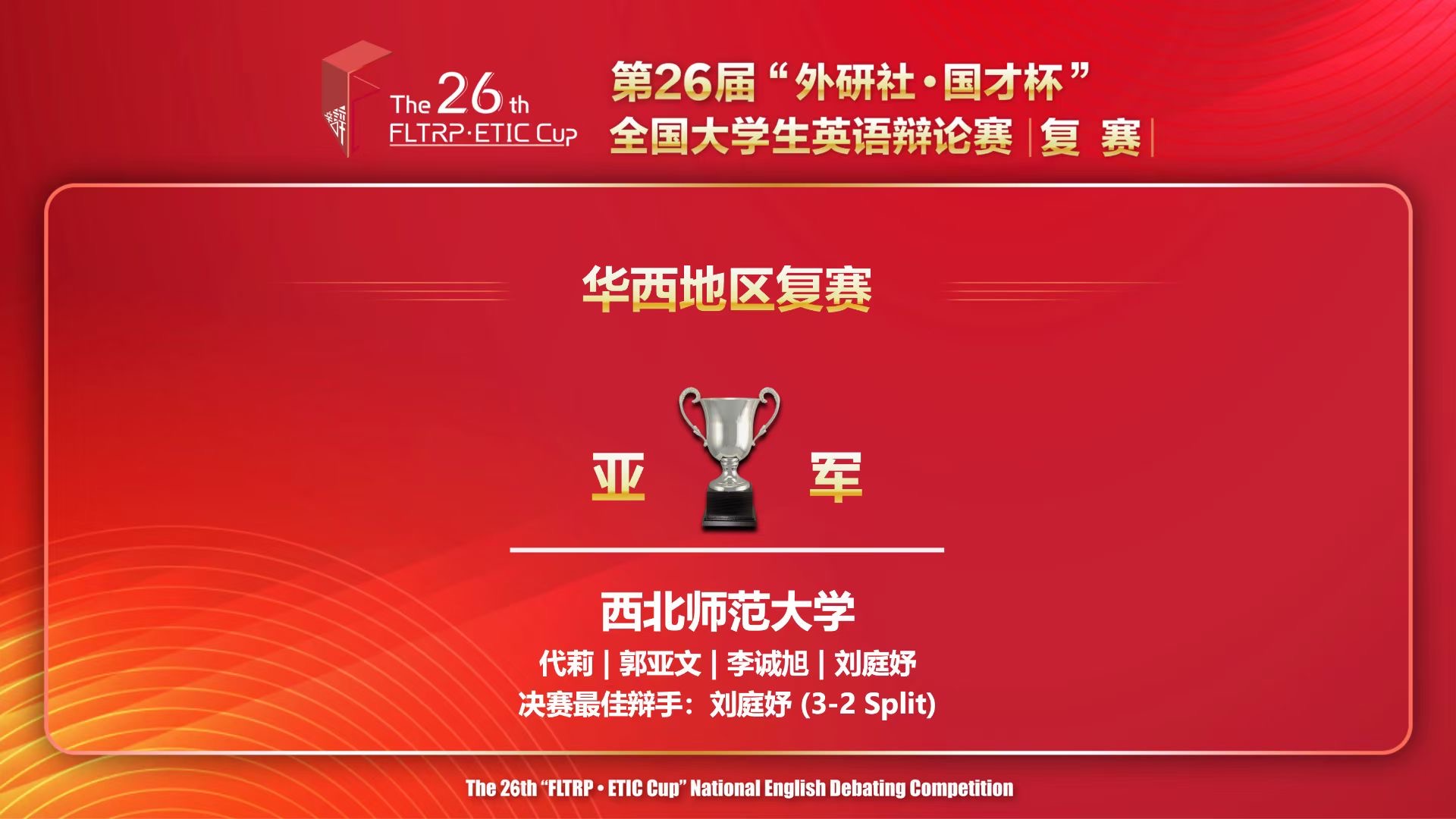 2024年4月21日,第26届“外研社·国才杯”全国大学生英语辩论赛华西地区赛在互联网云端落下帷幕。由我校yl6809永利代莉老师、郭亚文老师担任指导教师,21级英语7班李诚旭同学和22级英语3班刘庭妤同学组成的代表队凭借扎实的专业功底、严密的逻辑思维和敏锐的临场反应能力赢得大赛评委的认可,最终斩获地区赛亚军,并晋级全国总决赛。刘庭妤同学荣获决赛最佳辩手称号。