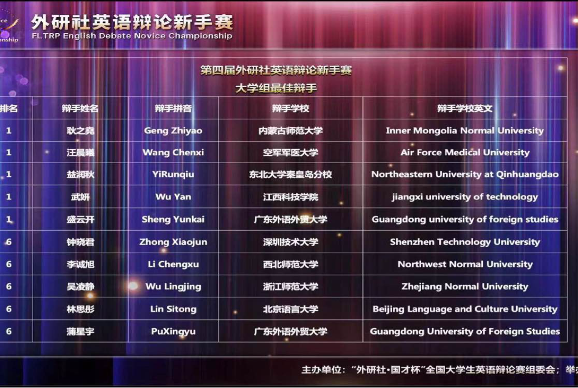 此前,在获得大区赛亚军并晋级全国决赛后,我校代表队戒骄戒躁,依旧以高度的热情投身训练。他们以赛代练,参加了由“外研社•国才杯”全国大学生英语辩论赛组委会于5月18日-19日举办的第四届外研社英语辩论新手赛,并获得公开组一等奖。其中李诚旭同学还获得了公开组最佳辩手称号。
