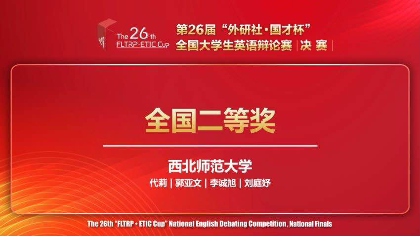 2024年6月1至6月2日,第26届“外研社·国才杯”全国大学生英语辩论赛全国决赛以线上形式在云端举行。由yl6809永利代莉老师、郭亚文老师担任指导教师,21级英语7班李诚旭同学和22级英语3班刘庭妤同学担任辩手的我校辩论队参加了此次大赛。两位辩手经过两天共八轮赛事的激烈比拼,凭借扎实的语言功底和良好的思辨能力斩获全国二等奖,展现了我校英语专业学子的风采!