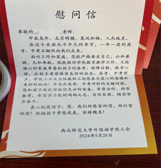 随后,安书记为老师们送上慰问信和书卡,预祝参加2024年中高考的教职工子女都能取得优异成绩,考入心仪的学校。一份问候传递一份关怀,一份牵挂凝结一份祝愿。学院工会将从教师生活点滴入手,服务全体师生,做有温度的教育!