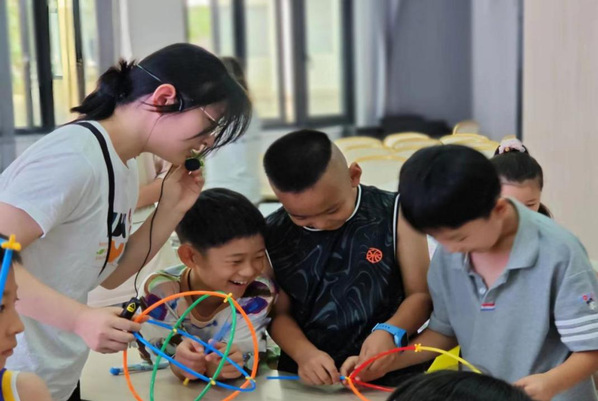 科技制作长本领,动手实践启智慧。在“小小眼观大世界”课中,从裁剪镜片、折叠纸板到组装镜头、调整带子……实践队员和孩子们一起制作VR眼镜,探索虚拟世界的奇妙;在“小小宇航员”课堂上,实践队员化抽象为具体,和小孩子一起制作火箭模型,启迪航天梦;在“吸管创意”活动中,实践队员用吸管、纽扣等简单材料,引导孩子们发挥奇思妙想,搭建心中的“世界”,在实践中提高创造力,激活创新潜能。