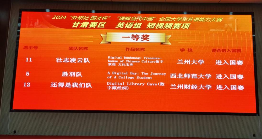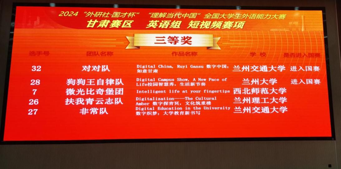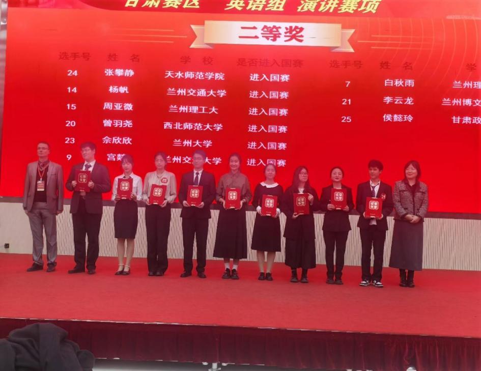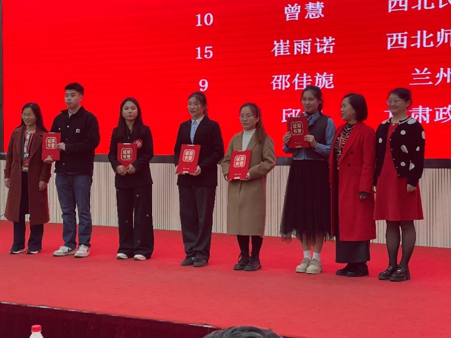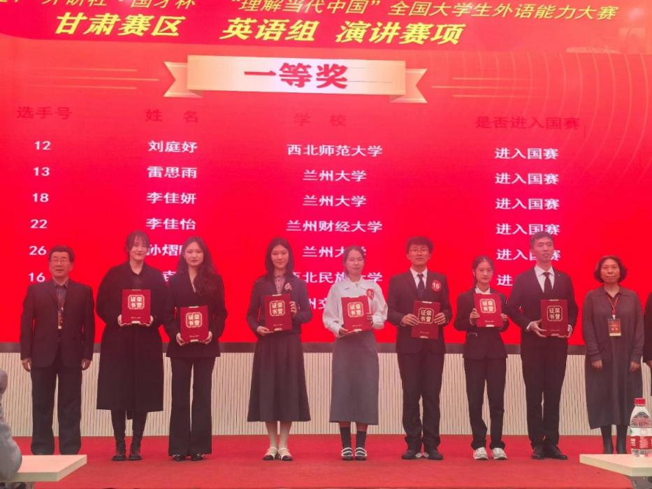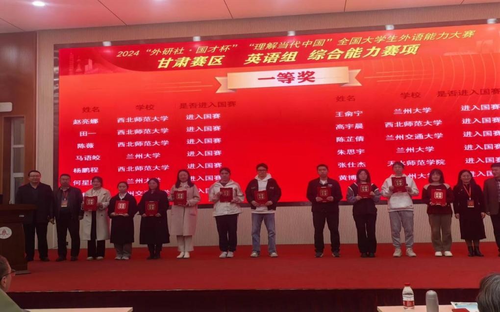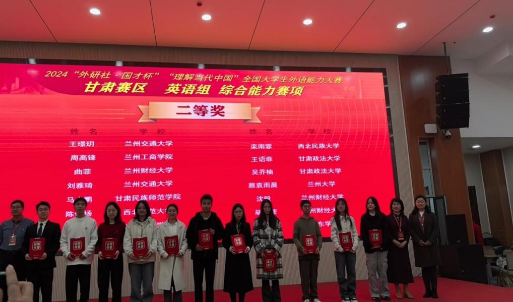 2024年11月2日,2024“‘外研社·国才杯’理解当代中国”全国大学生外语能力大赛甘肃赛区复赛在兰州财经大学成功举办。本次大赛由甘肃省教育厅主办,兰州财经大学、甘肃省大学外语教学研究会、外语教学与研究出版社承办。大赛涵盖英语演讲、综合能力、口译、笔译及短视频等5大赛项,全省20余所高校选派优秀学子参加省级复赛。在本次大赛中,我校14名(组)同学获奖,获奖比例高达82%,学校同时获大赛优秀组织奖。