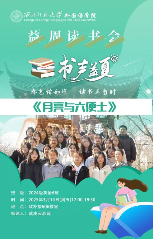 3月14日,yl6809永利“益”周读书会第六十五讲在致朴楼606室举行。本期读书会由2024级英语6班承办,班主任武凌云老师主讲,英语6班全体同学参加。读书会以经典名著《月亮与六便士》为主题,围绕“月亮”与“六便士”何者更为重要展开了一场思想的碰撞与深入的探讨。
