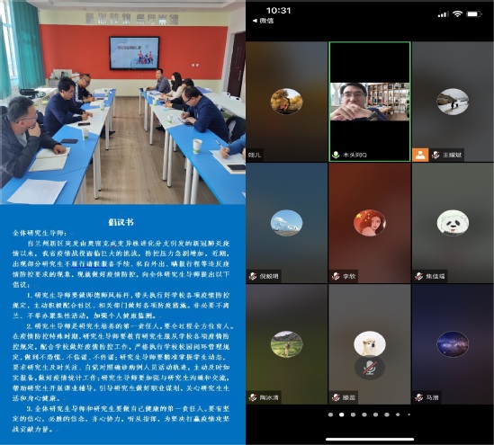 各学院高度重视,马上进入“战时”状态,要求导师做好研究生思想工作,加强线上指导,保障研究生教学和学位论文预答辩等工作顺利开展。马克思主义学院院领导与博士、硕士班级结对子,通过线上班会传达疫情防控要求,倾听学生诉求;文学院举办了多场线上“云端见面会”,全体院领导深入到研究生当中,就疫情期间同学们关心的问题进行答疑解惑。